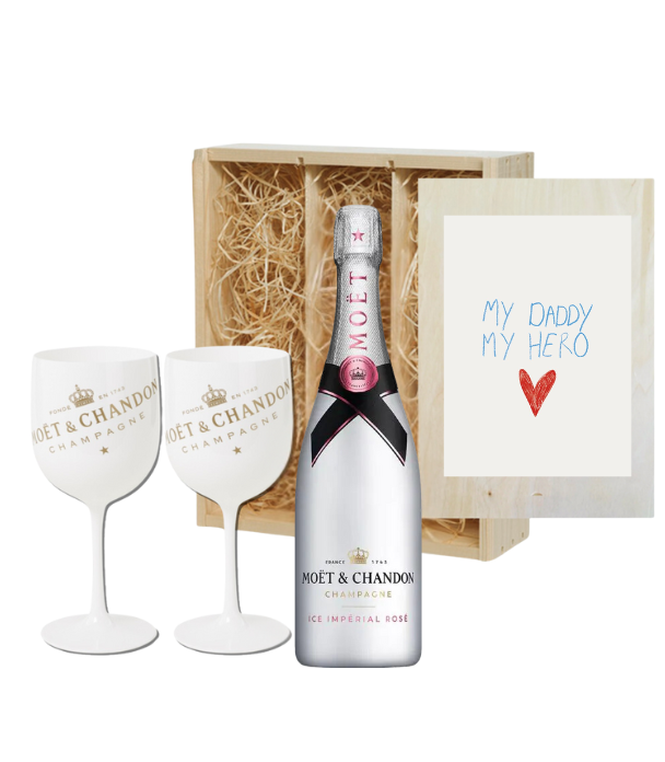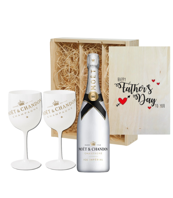Geef Vaderdag een stijlvolle twist met deze luxe geschenkset: een gepersonaliseerde houten kist met een fles Moët & Chandon Ice Impérial en twee elegante glazen. Deze bijzondere champagne is speciaal ontwikkeld om met ijs te drinken en verrast met een frisse, tropische en fruitige smaak – ideaal voor een zomerse toast op jouw vader.
