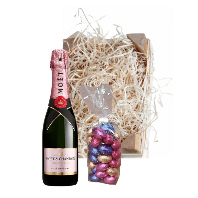 Het Moët & Chandon Paaskratje Rosé 37,5CL is een stijlvol, vrolijk en luxe Paasgeschenk gevuld met een half flesje Moët Rosé Impérial en een selectie luxe paaseitjes. Een perfect cadeau voor Paasbrunch, familiediners, lentevieringen of als elegant relatiegeschenk.